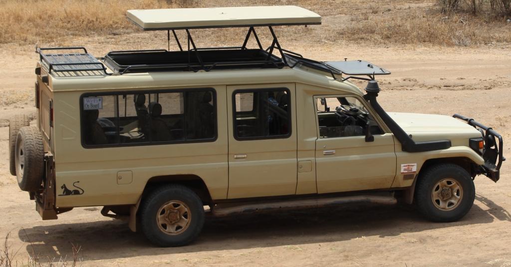 Fitted with three opening game viewing roof hatches or pop-up roof with a large luggage space behind the seats and roof rack for camping gear. Removable sun shade cloth, 2 spare tires, VHF radio call, tool kit, high lift jack., tow rope, jump leads, cool box holder. Larger leg space than land rover.